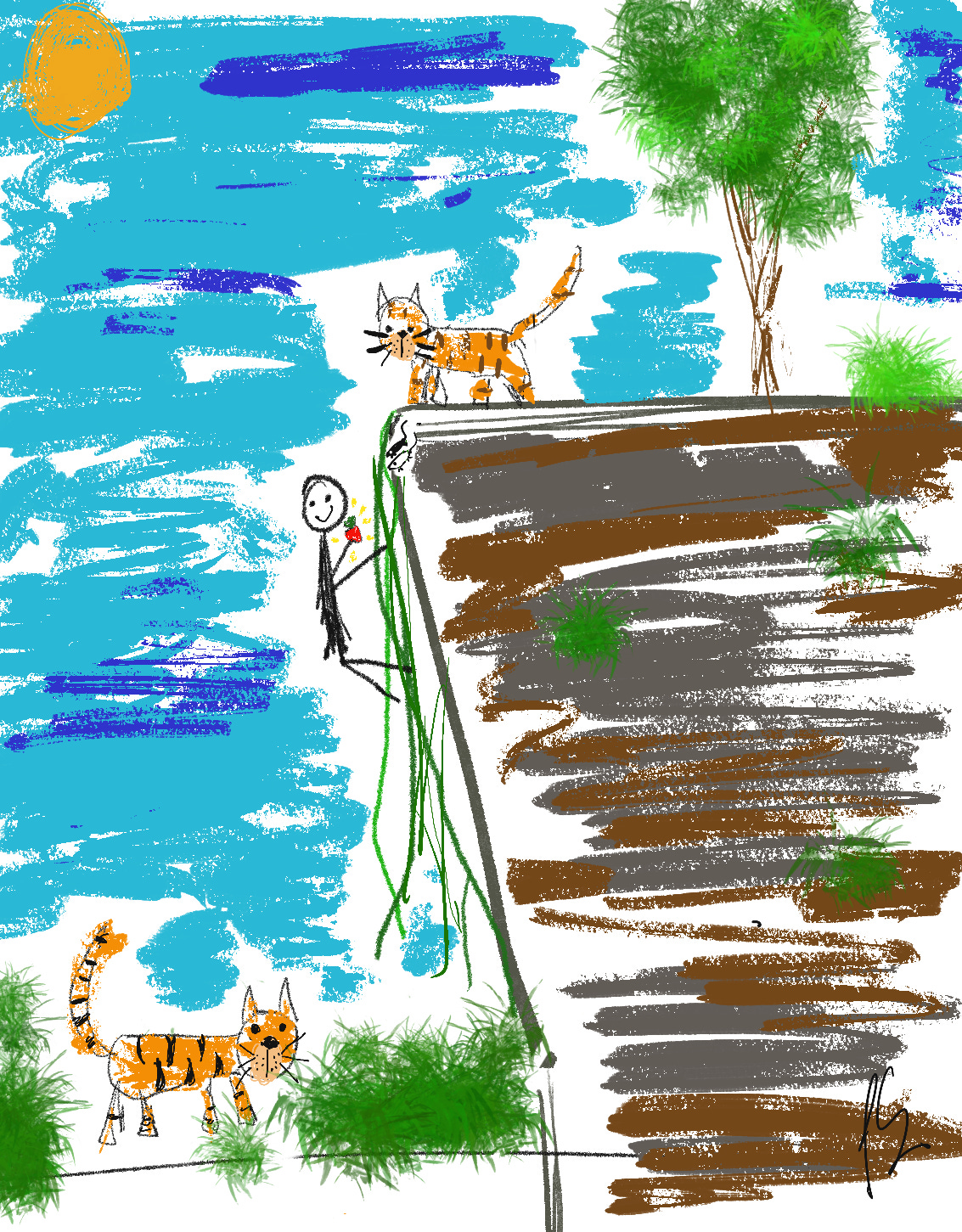 “A man traveling across a field encountered a tiger. He fled with the tiger after him. Coming to a precipice, he caught hold of the root of a wild vine and swung himself down over the edge. The tiger sniffed at him from above. Trembling, the man looked down to where, far below, another tiger was waiting to eat him. Only the vine sustained him. Two mice, one white and one black, little by little started to gnaw away at the vine. The man saw a luscious strawberry near him. Grasping the vine with one hand, he plucked the strawberry with the other. How sweet it tasted!”